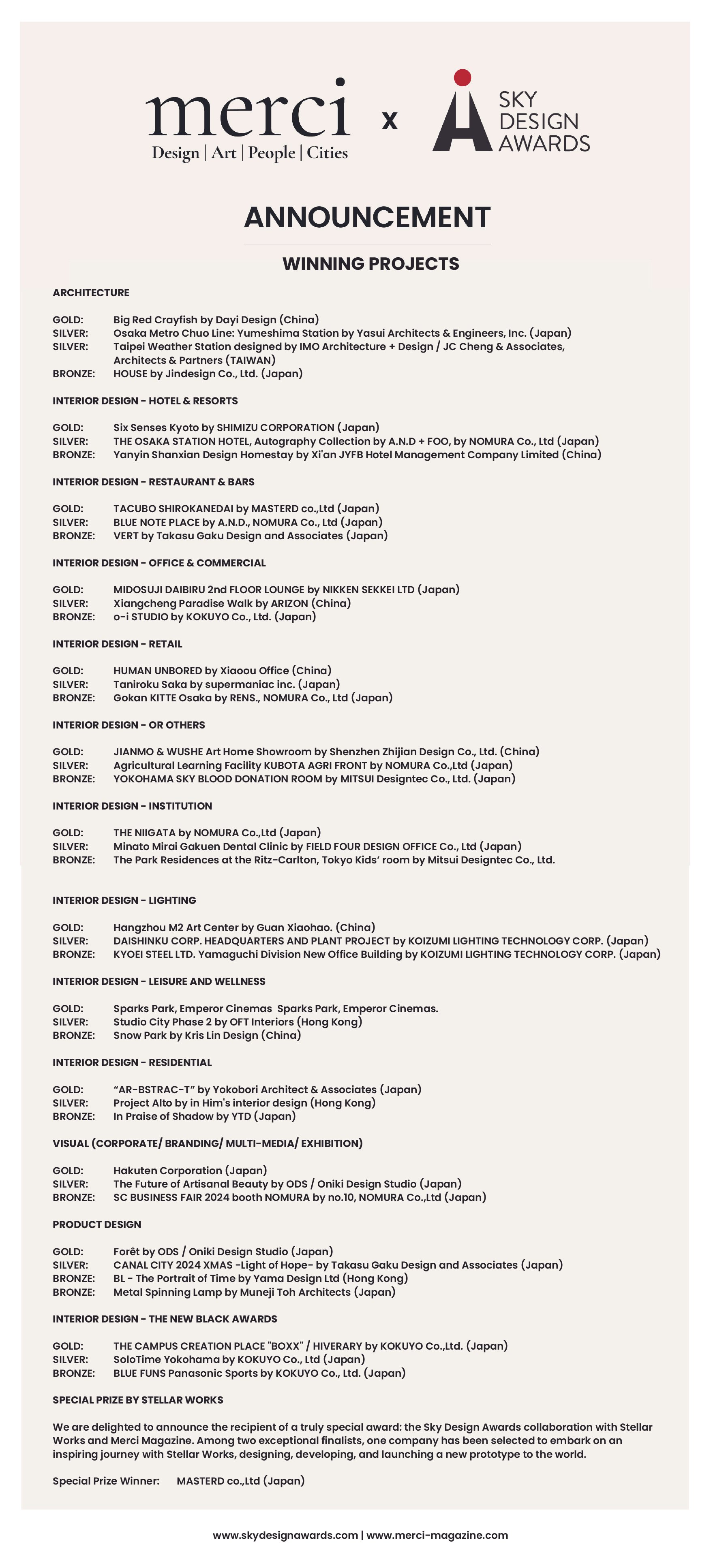 We are pleased to announce that the Sky Design Awards will be merged into the Merci Magazine platform starting from the 2026 edition. This integration will streamline the application process and provide participants with stronger international exposure through Merci’s global media partnerships.