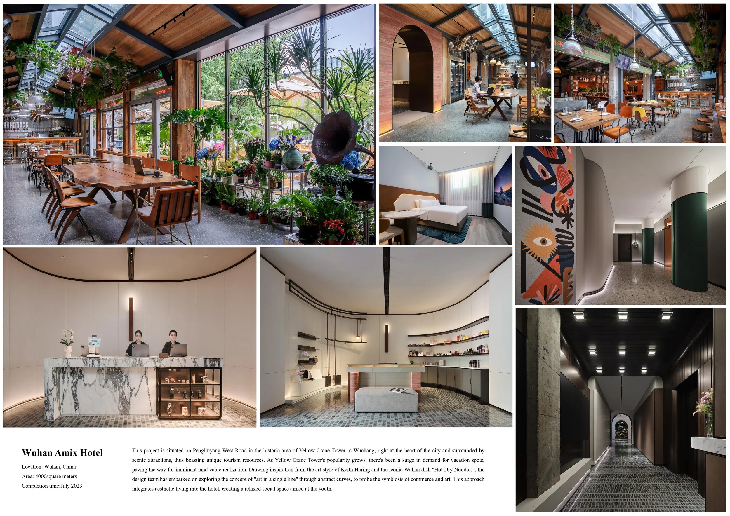 This project is situated on Pengliuyang West Road in the historic area of Yellow Crane Tower in Wuchang, right at the heart of the city and surrounded by scenic attractions, thus boasting unique tourism resources. As Yellow Crane Tower's popularity grows, there has been a surge in demand for vacation spots, paving the way for imminent land value realization. Drawing inspiration from the art style of Keith Haring and the iconic Wuhan dish "Hot Dry Noodles", the design team has embarked on exploring the concept of "art in a single line" through abstract curves, to probe the symbiosis of commerce and art. This approach integrates aesthetic living into the hotel, creating a relaxed social space aimed at the youth.
