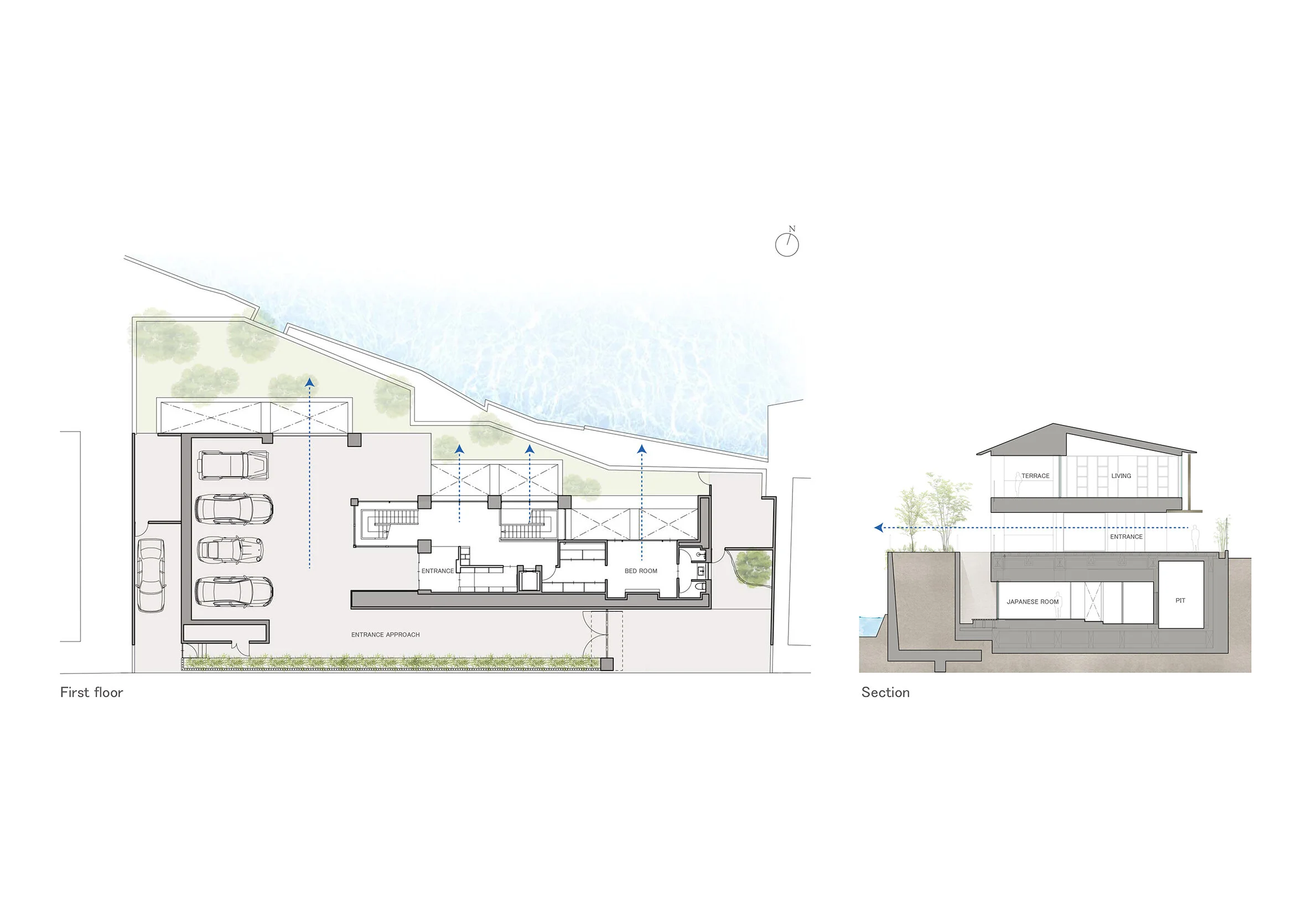 To blend well with surroundings, we designed low-rise residence with providing visibility of the lake through the façade wooden lattice along the street on the Southside. The Northside facing to the lake is widely opened to enjoy the natural landscape of various trees. The residence has consisted of 3 stories, a basement floor, and two upper ground floors.